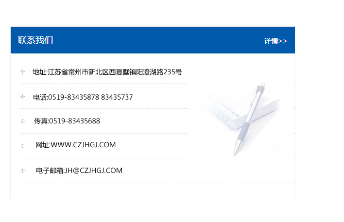 地址:常州市新北區友邦商務大廈1幢16、17層  電話:0519-85101652  傳真:0519-85112595  郵編:213022  網址:www.cz-jiayue_cn.jszhjg.com  郵箱:xiajifengaa@163.com
